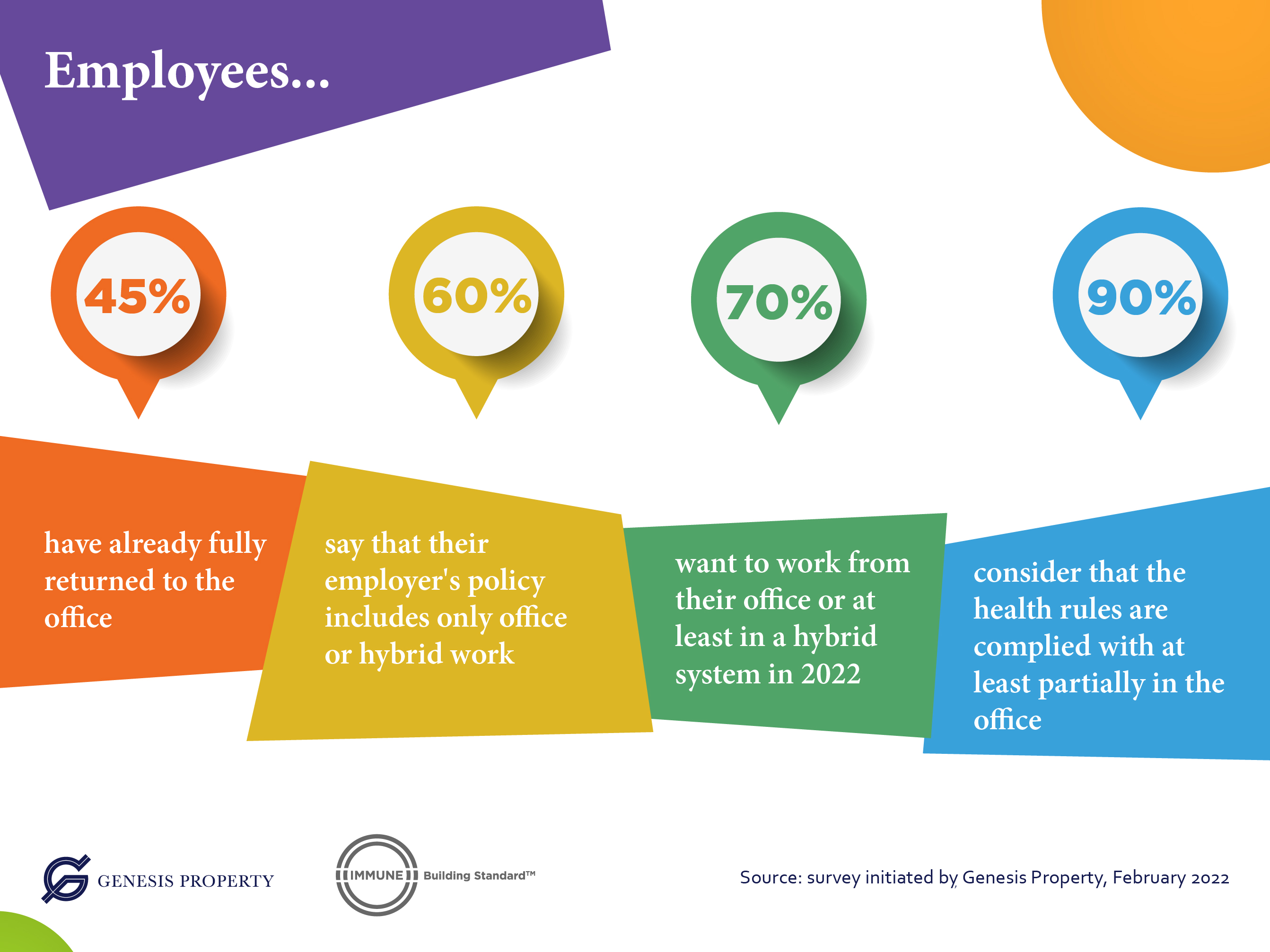 09 March 2022. Romania has ended the state of alert almost two years after the start of the pandemic, and companies shift their operational plans moving forward based on an increasing number of employees returning to the office in the near future. Nearly 60% of employees say their company's policy is to work only from the office or in a hybrid system with mainly physical presence, while another nearly 30% go to the office only when they need to interact with colleagues or feel the need to socialize. More than 70% want to work from the office in 2022 or at least in a hybrid system, according to a recent survey of 1,073 employees nationwide by Genesis Property.