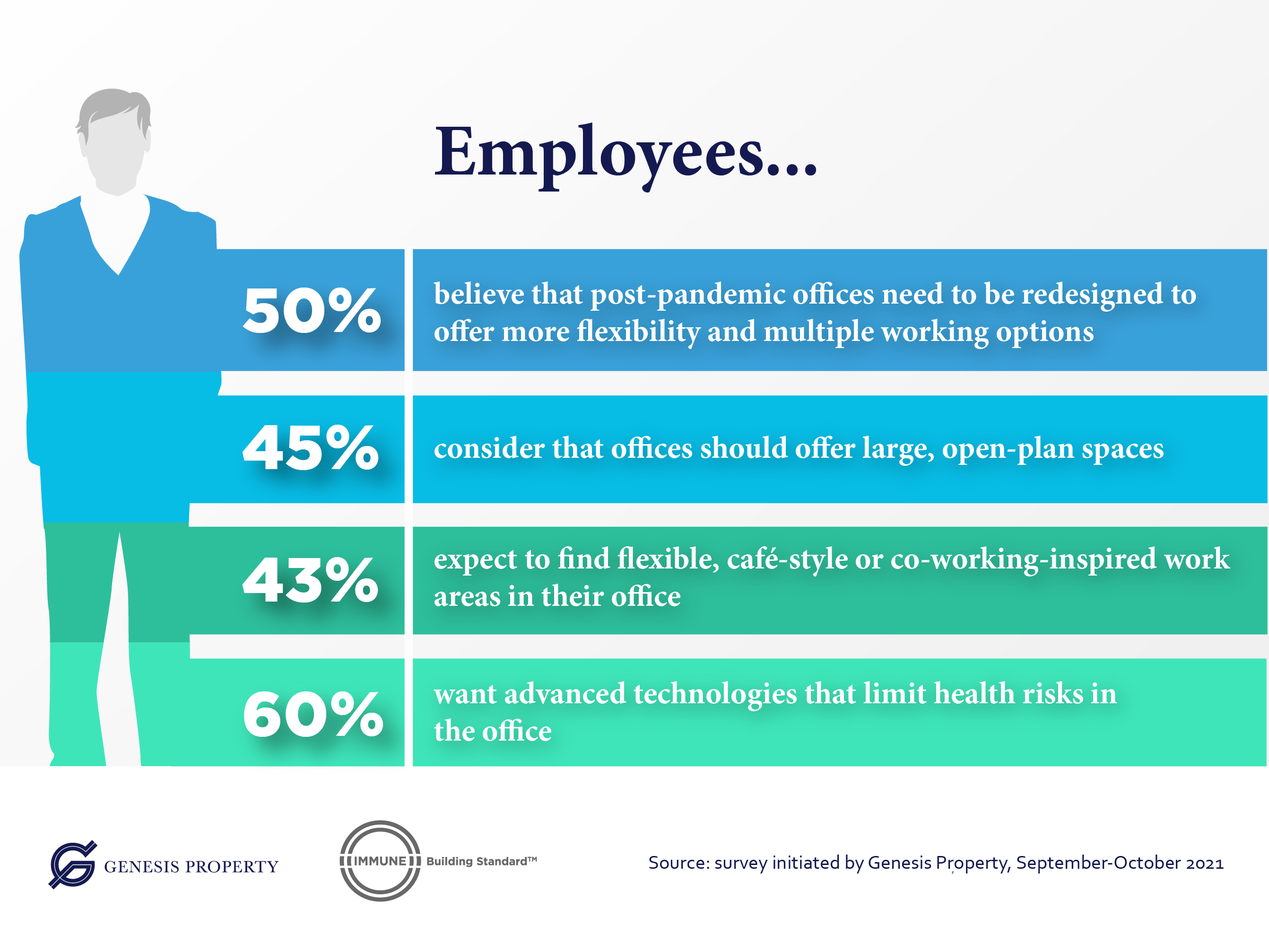 Most of the measures that employees in Romania want are already laid down in the IMMUNE Building Standard™, developed by the Romanian company Genesis Property in 2020 specifically to assess and certify the health of indoor space. The standard proposes 135 consistent measures that provide building owners or companies with the necessary tools to monitor and adjust the health of workplaces.